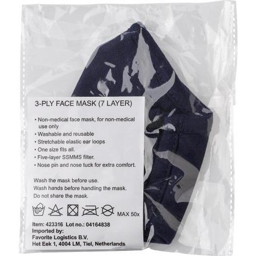 Wiederverwendbare Maske aus Baumwolle und Polyester mit elastischen Bändern für einen bequemen Sitz. Waschmaschinentauglich. Nicht für den medizinischen Gebrauch geeignet.